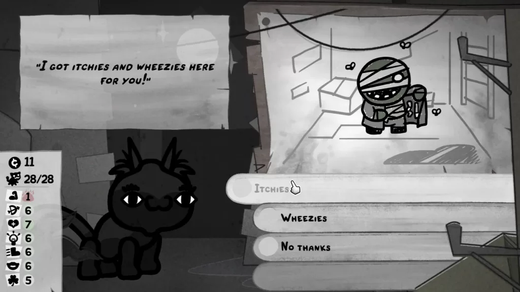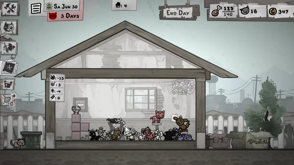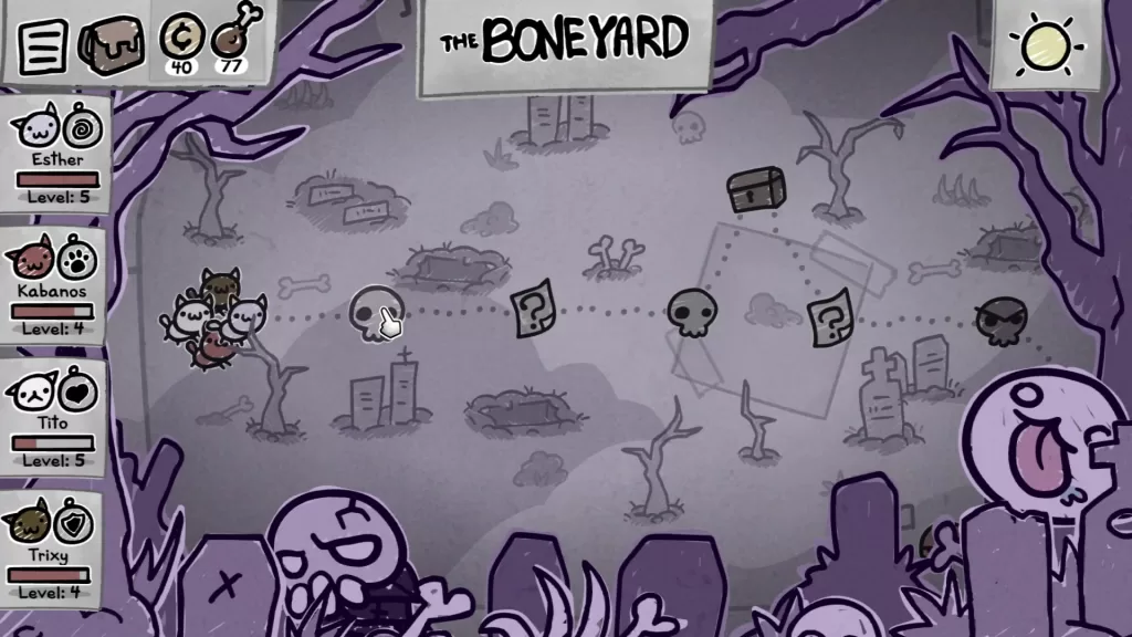 Home is where the hub is, and it’s filled with all your little gremlins who grow older as time passes. Each run counts as a lovely day out, with booty like money, food, and items all whizzing into your storage. Food is the equivalent of rent here, as more cats mean more mouths to feed as day turns to night. A sequence of bad runs? You’ll keep only a fraction of what you stocked up on those runs, but you’ll have fewer mouths to feed and, mercifully, less chance of starvation. Good runs? You’ll have enough Whiskas and moola to last you several decades.