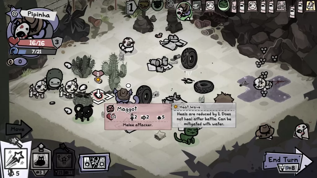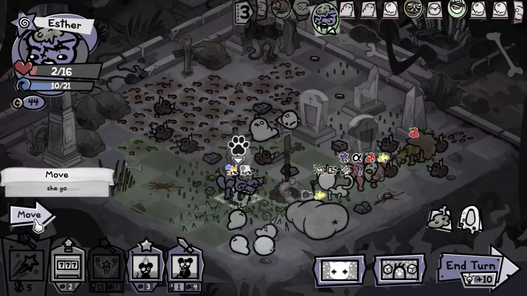 When not engulfed by faeces fiends, bosses are smart extensions of the environments they exist in and require thinking ahead, whether to coax or pin or suffocate. Some are infuriating, like one Solid Snake wannabe who just sits in bushes (increases his dodge chance, the bastard), then litters the board with steel traps (I hate him). Others like a cowboy cat shoot at “anything that moves”, so it becomes a tactical exercise in draining his moon clip and lining up your furry pieces well enough to capitalise on a turn where he’s unable to retaliate.